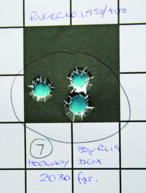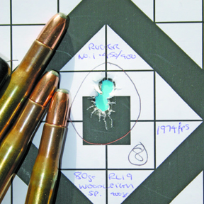 The Hornady DGX gave 2030 fps/3661 ft/lbs and was the best load with this bullet and at 60 yards, typical ranges for this type of rifle, it grouped three shots into an inch nicely. The best groups went to the Woodleigh 400-grain Soft points with 80-grains of Reloader RL 19 giving 1974 fps/3462 ft/lbs energy with tight three shot clover leaf groups. Solid bullets were less accurate at 1.5 -2.25”; but a Cape Buffalo is a big target and penetration would be your main concern.