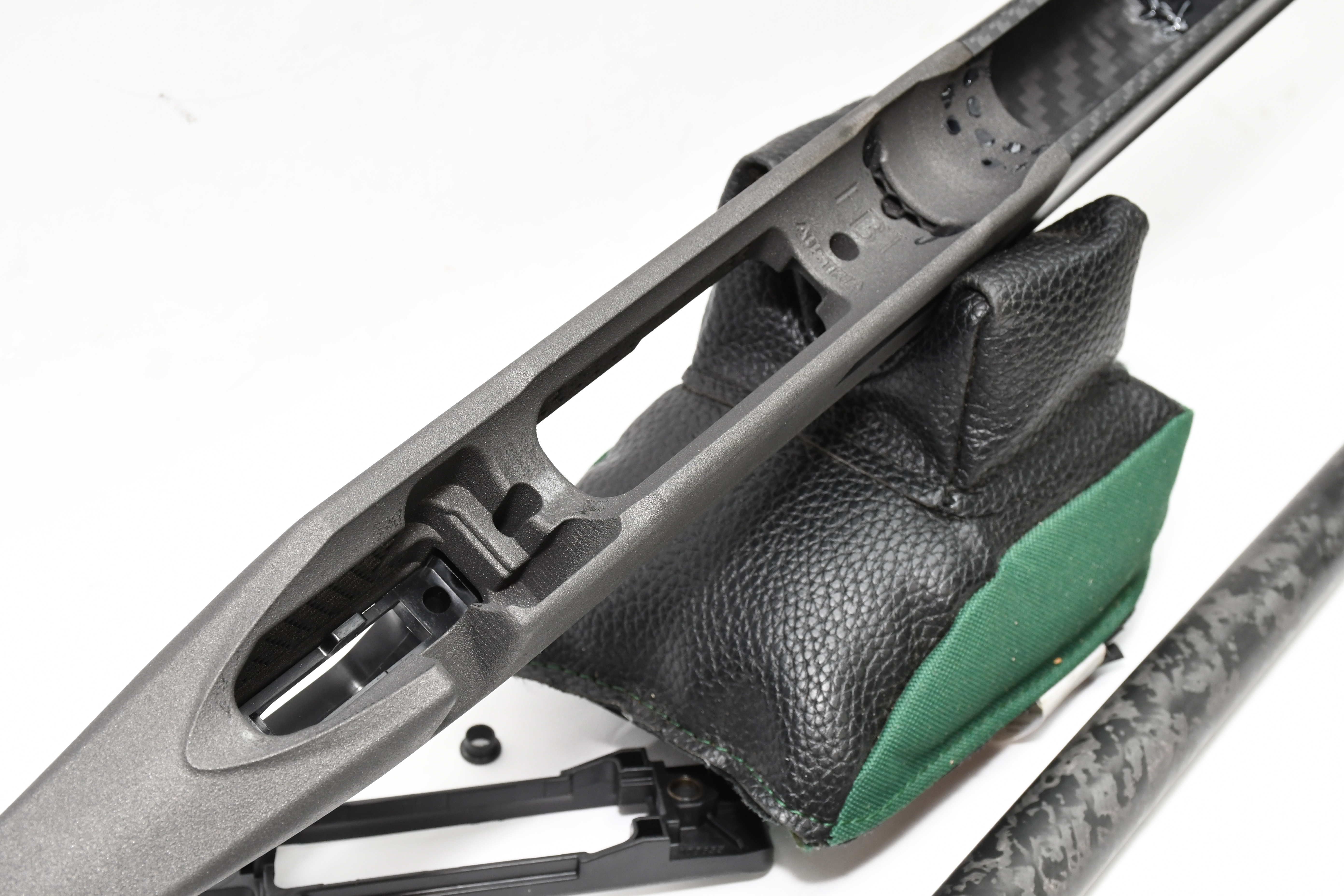With the gun removed from the stock, the inlet appears to support the action without applied stresses. There are two Allen-headed action screws which, when tightened, come to a firm stop and don’t exhibit compression or bending within the bulk material. The fore-end studs are securely bonded in place, although you can see how thin the stock actually is. There’s no sound-deadening material either, so it can be a bit ‘tappy’ when handled.