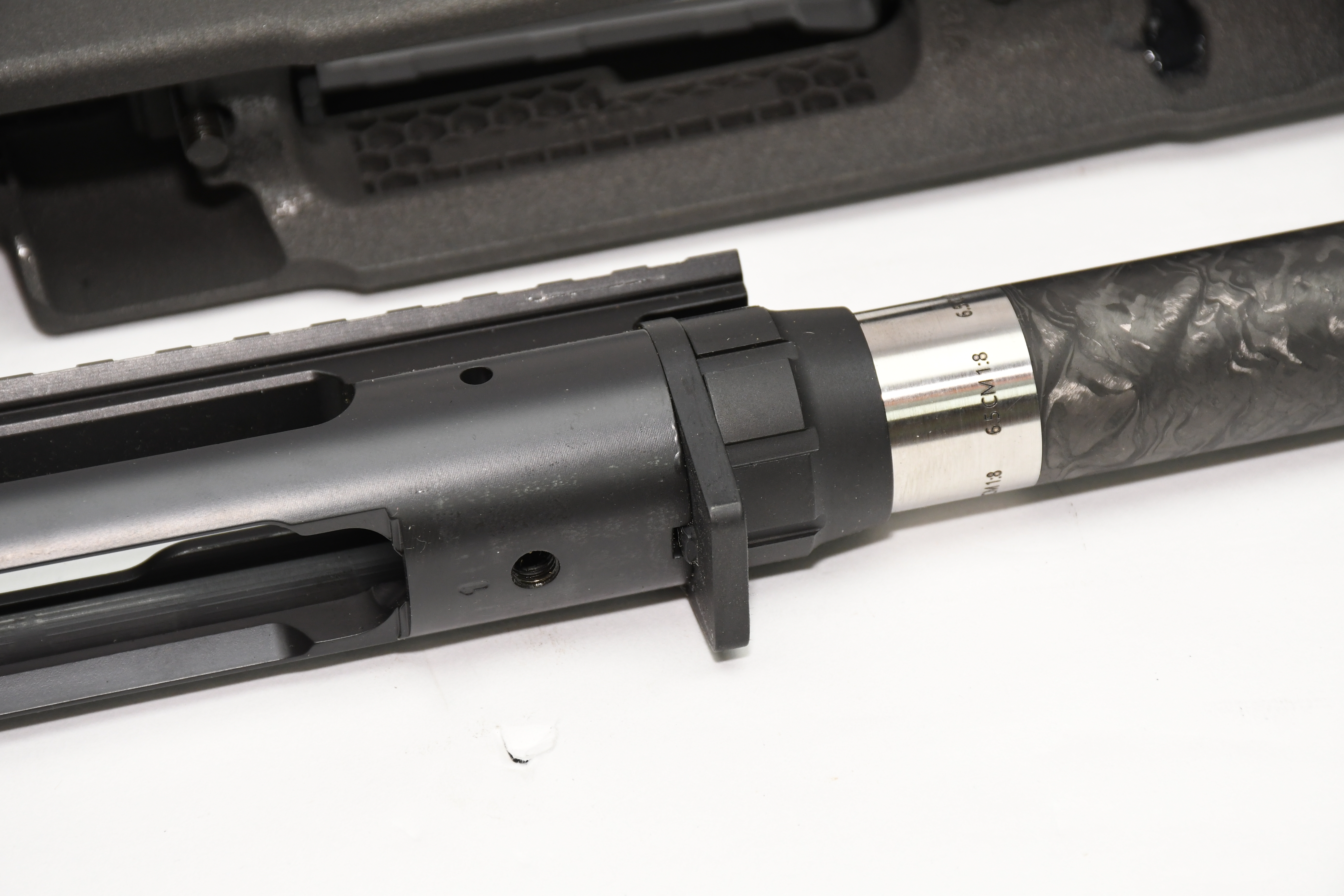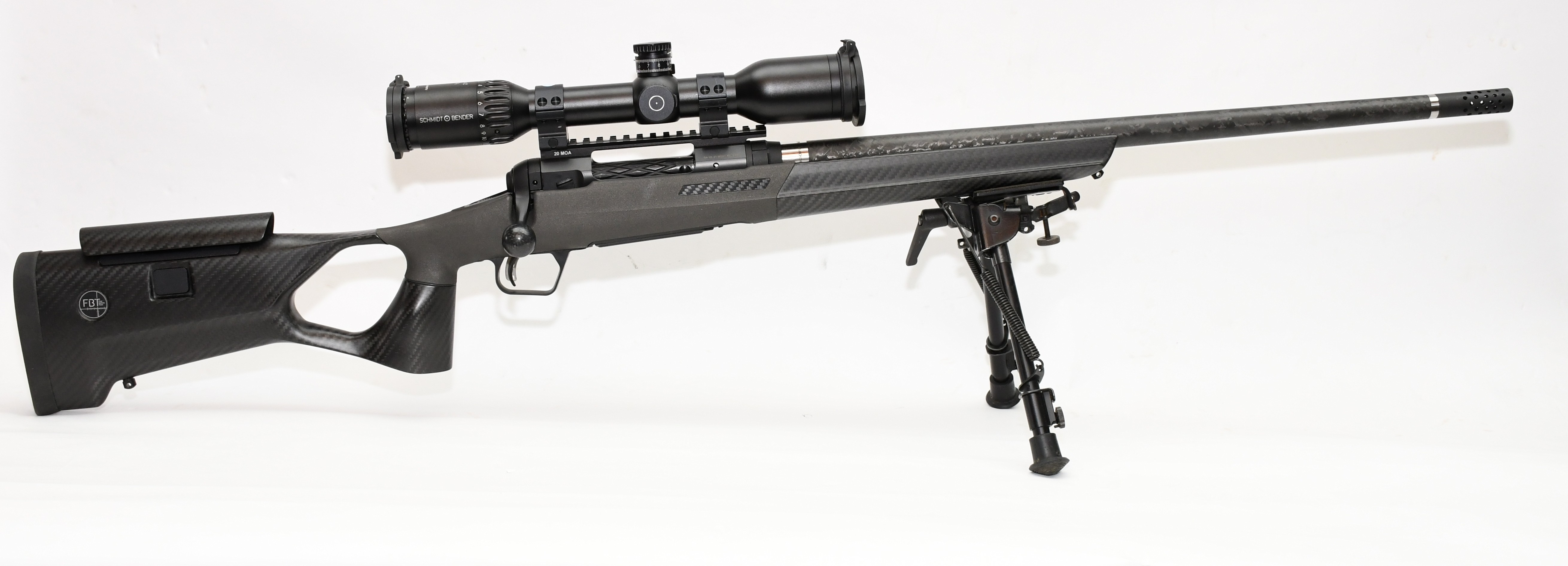 Savage has teamed up with Proof Research for the carbon barrel. I have used, and still own, one of these carbon-fibre-wrapped stainless steel units and, quite frankly, would say it is one of the very few carbon-fibre barrels I would trust. This one shows what is called a Light Sendero profile, and it runs a 1:8” twist for 6.5mm bullets. The muzzle is threaded 5/8"x24 and comes fitted with a compact pepperpot Omniport muzzle brake. Small areas of stainless steel are visible at the muzzle and action reinforce, but the finish is otherwise the matte carbon-fibre weave on display.
