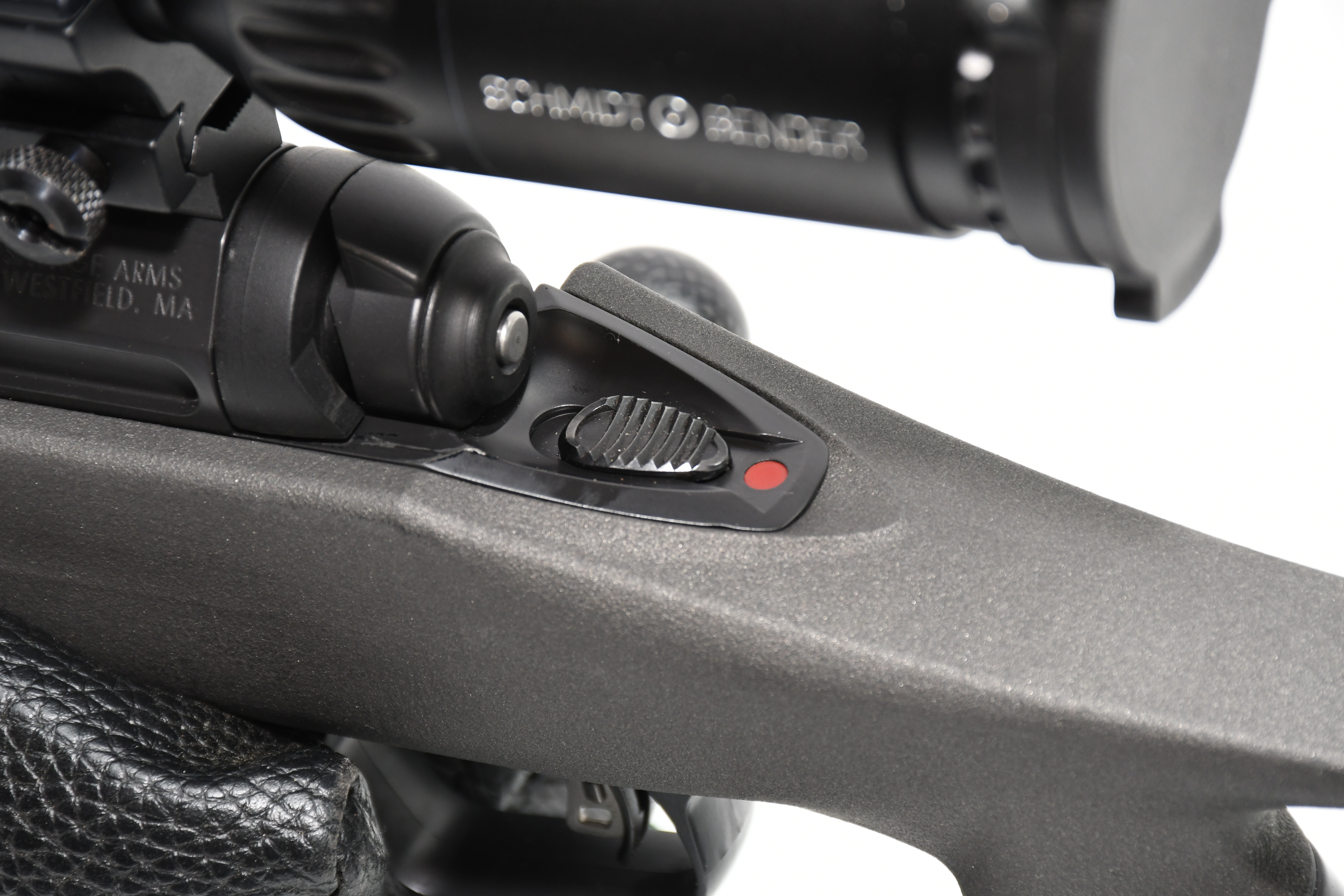 A bolt shroud at the rear includes a visible and tactile cocked-action indicator above the three-position tang safety. The safety is quiet in operation, moving forward for fire, middle for safe with bolt operation, and rearward for safe with the bolt fully locked. A bolt removal button on the right side of the action works in conjunction with the trigger.