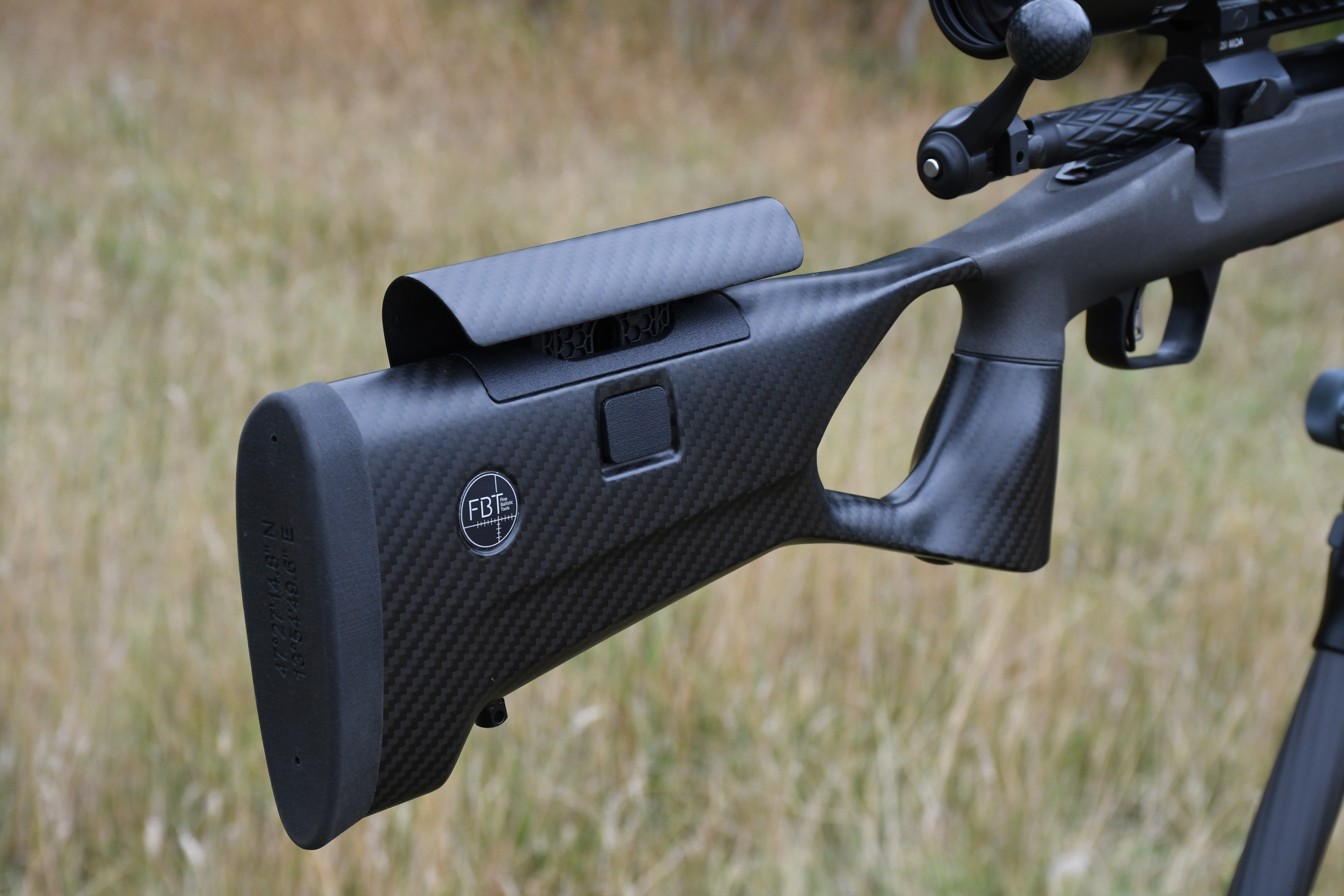The trigger guard also appears to be polymer, offering enough space for a gloved finger, although it is quite a thin moulding. Carbon-fibre reappears at the ambidextrous vertical pistol grip, which shows a bilateral palm swell. The thumbhole is generously sized to accommodate a full grip, with the upper and lower beams blending seamlessly towards the recoil pad at the rear. The 140mm-long comb is adjustable vertically by approximately 30mm for scope/eye alignment, actuated via a sprung button on the right side of the butt. The comb itself is a single layer of carbon-fibre, kept thin to save weight on the otherwise quite low butt.