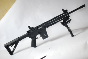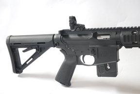 The rifle strips the same as the M16 with push pins holding the upper and lower receivers together and the bolt pulls out, so cleaning is easy too. Though identical in layout and operation there are two versions - the standard M&P15-22 and the MOE (Magpul Original Equipment) version. The former shows the old Rock River butt and detachable M16-type sights and A2 pistol grip. The Latter has Magpul butt, pistol grip and their MBUS, fold-down iron sights. A 25-shot magazine is included with either model.