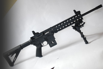The M&P is a little different as it’s all polymer construction. The lower has the buffer tube moulded-in and the upper is combined with the Picatinny, 4-way, free-float forend, making it light at just 5lbs empty. All controls function with working automatic and manual hold open systems, there’s even a functioning case deflector as the 15-22 has a 22 Long Rifle sized ejection port.