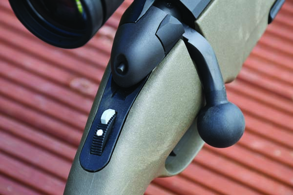 Steyr has an interesting concept whereby their tang-mounted, three-position roller safety gives forward for fire, middle for safe with bolt operation, and rear for safe with bolt lock, with a small blade arising from the dial. There are red and white markers but with the roller all the way rearward and the blade up, the bolt handle itself will push further down and close right into the side of the stock, minimising bulk when carried. As soon as you push the safety roller forward, the bolt handle springs up and enables fast, smooth action cycling, which I found fundamentally difficult to even deliberately jam. Rolling the safety rearwards with the bolt already open enables bolt extraction.