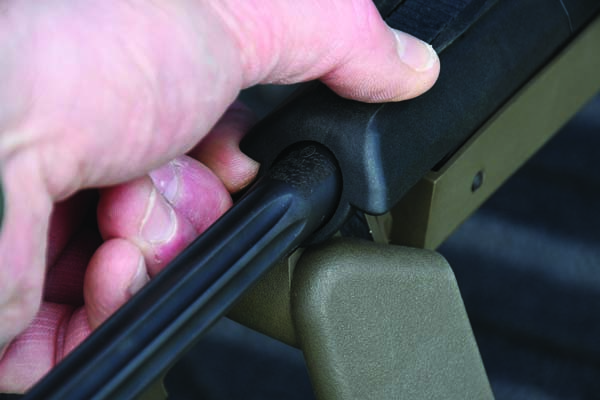 Another interesting feature of the Scout concept is the presence of two magazines. One magazine is located under the receiver as expected, while the other is clipped under the buttstock. This setup gives the rifle an overall capacity of 5+1 in the main magazine, plus an additional five rounds in the magazine stored in the buttstock. The mags use twin side catches for easy release and replacement. They load from the top into two columns, which is a less common but attractive feature for many bolt-action .223s that don’t use AR-derived magazines. An interesting detail is the butt’s mag well has a sprung follower inside to prevent any spare rounds from rattling during transit. Great!