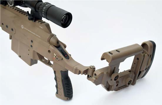 There is a hinge mechanism allowing the stock to fold with a strongly sprung latch that locks the gun securely straight or folded. The latter position shrouds the bolt handle for protection and makes storage and transportation of this large, heavy rifle much easier. It also makes bolt removal and cleaning a lot simpler as there is no need to move the cheekpiece!