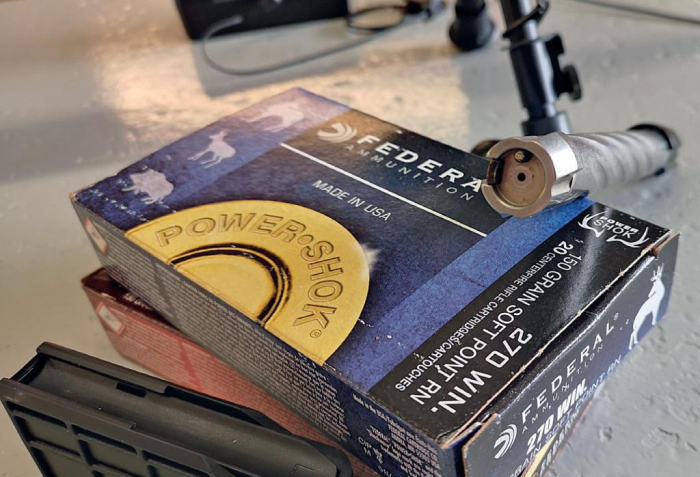 For the test, GMK supplied a Steiner Ranger 4-16x56 scope, which I attached using some of their Optilock mounts. I was pleased to find they had also sent me a large Stalon X149 reflex moderator to keep sound and recoil to a minimum. Ammunition was from Federal and included some Power Shok 150-grain soft points and some 130-grain Nosler ballistic tips. The published velocity figures are 2830fps and 3060fps respectively. I was interested to see how much speed was going to be robbed by the 20” tube and how a rifle weighing around 3kg (naked) would behave given the chosen calibre!