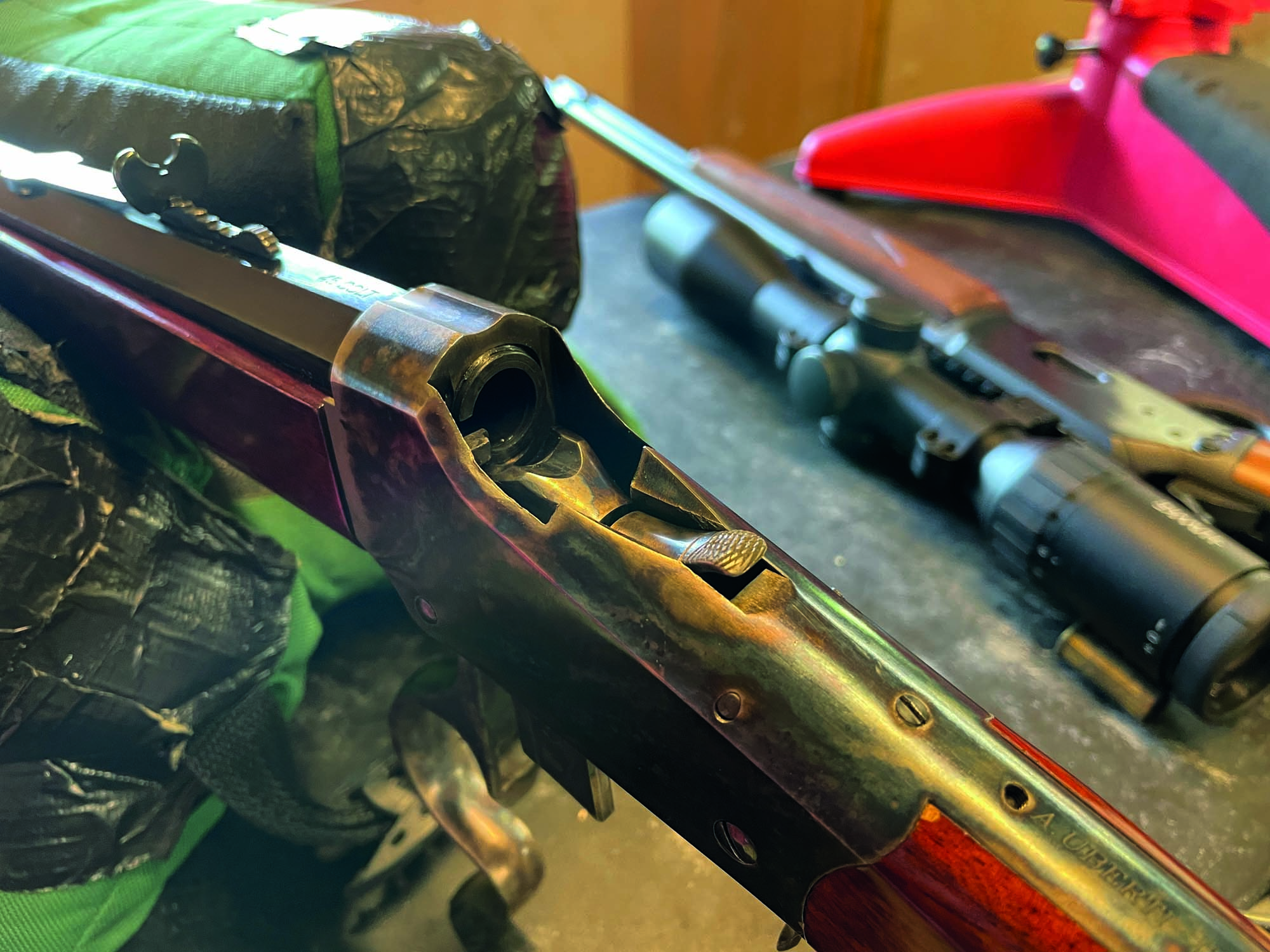 The falling-block action is akin to an artillery piece, with its enclosed breech ring giving it inherent strength. Operation is via an S-shaped lever, which acts as a trigger guard. Push it down and forward, and the block drops for loading. As it closes, the hammer is set to half-cock, ready for a final thumb cock to fire.