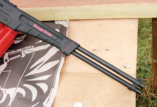 The barrels are retained and stabilised at the muzzle by an angled Fig-8 clamp that also mounts a thick, fixed blade foresight. The .410 tube is Improved Cylinder bored judging by the patterns it throws, also to allow the use of slug ammo, which in terms of energy will equate to around a 38 +P or 357 Magnum pistol cartridge. Atop the monoblock is the rear sight, this offers a small U-notch and limited elevation and windage adjustment. Primitive but good enough to zero up to 50-yards. However, Savage have made bit of a mistake as the notch is too near the eye and is not crisp or defined; an aperture would have been better. One thing very much missing is any way to mount an optic, given the moulded forend; surely an integral Weaver base would have not been a problem?