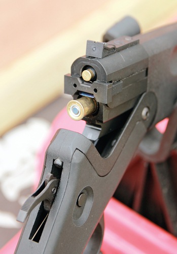 The .410 ammo was pretty hot as a couple of times the primer was pierced and extraction proved stiff in this case, recoil though easy was certainly noticeable. Like any manually-operated gun you soon get used to the way to do things. Shoot, open the action and pump back on the ejector plate then pick the case from the chambers.