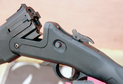 Controls consist of an external, manually cocked, rebounding hammer with a hinged firing pin that allows you to select top or bottom barrel by simply moving it up or down. The safety is most practical and consists of a large, cross- bolt plunger located under the hammer on the wrist. It pushed right to left to FIRE (red ring showing) and reverses for SAFE. The safety simply blocks the hammer movement and SAFE or FIRE the trigger operates and it falls. The opening lever is located in front of the trigger guard and pulls back to unlock the action, which will fall open.
