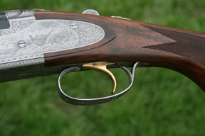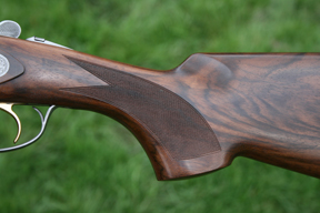 First impressions of our EELL twin are good. The gun has the usual - and most attractive - game-scene engraved, side-plated action with which we are familiar. Barrels are both 28" long and equipped with multi-chokes and narrow game ribs. Top lever, trigger guard and forend irons are nickel plated. This EELL has the traditional Beretta schnabel forend rather than the new American style as mentioned (essentially a schnabel with front lip removed). The stock has the usual half-pistol grip too - sometimes mistakenly called a Prince of Wales. The stock is well presented with something that looks much like a traditional oil finish (though I suspect that it is not quite that).