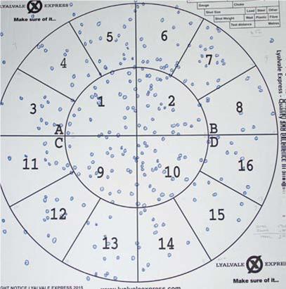 This was by far the best loading combination with this shotgun and choke setup. Recoil was mild, despite the obvious good speed and the patterns were superb. More strikes obviously with the smaller shot size of No. 7.5 and a total of 295 pellets. Incredibly even density also, that repeated with dense 119 inner circle hits and 176 other 30-inch strikes with great distribution. What a great closer range partridge or vermin load, superb.
