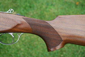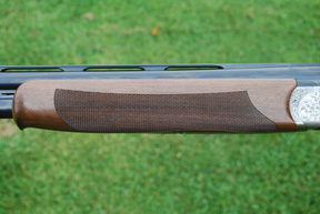 First impressions of the test gun are definitely good, all the more considering it’s RRP of only £935 (£999 in 20 bore). It has 30” barrels (there is a 28” option) and looks attractive with a silver polished, gold inlaid action - the details of finish are excellent considering the price. Neat metal work, multichokes, good barrel blacking, well finished wood, and attractive embellishment. Bring the gun to the shoulder and one does not mistake it for a Purdey, but it is a perfectly acceptable shooting iron that does not weigh too much (around 7 ½ pounds all up) and is reasonably well balanced, though a little front heavy. There is a subtle taper to the 10-7mm rib. The pistol gripped stock - with slight palm swell - feels comfortable as well.