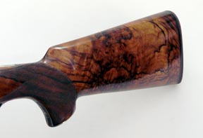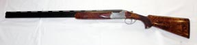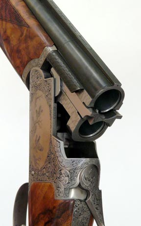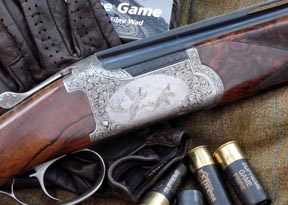 The steel boxlock action which displays a distinct rounded appearance is once again based around the Boss style with the two locking lugs extending from the standing breech and locating in the corresponding indents set into the powerful, well timed ejectors. The outer surface of the action, top and extended bottom tangs, top-lever and manual safety-catch are decorated with a scroll and foliate design. This in turn repeats on the trigger-guard where facility has also been made for the owner to have his or her initials engraved. Within the main panels of engraving lighter, impressionistic game scenes have been applied with partridge, pheasant and ducks all in various stages of flight. A point I would personally pick up on is that although well executed, the game bird engraving needs to be slightly deeper or made more pronounced, the surrounding panels of scroll work rather overwhelms the delicacy of the miniature landscapes.