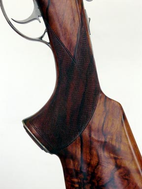 The semi-pistol grip configuration stands out, being finished with a fine foliate frame grip cap. Chapuis have developed the habit of lowering the gentle palm swell. Providing you place your hand where Chapuis intended, the fine panels of chequering directing your hand accordingly, the overall effect is to generate a lower and a somewhat more relaxed hand and arm position whilst opening up the shoulder pocket. This in itself may seem very little but after a full day’s driven game shooting its noticeable how more comfortable your arm will feel since the correct positioning of your hand has the direct consequence of placing the rest of your arm and shoulder into a more natural posture.