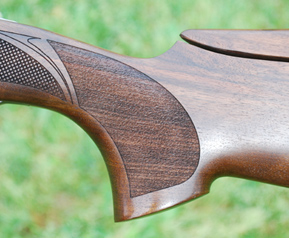 I did not have my measuring gear with me in Italy - but I would have guessed the drop at heel was about 2 3/8” - about ideal for an adjustable comb gun. There was slight cast, and the length of pull was near the standard 14 ¾” with the trigger in its middle position. The schnabel forend may have been a bit radical, but it offered good purchase as well as lots of bumps and squiggles. The forend has a sliding latch fastener (not my favourite) and an adjustable tensioning feature. The latter was an interesting feature. It allows one to tighten the gun either for personal preference or because of wear by means of two screws. The stock was oil finished (by hand), and the work was, once again, competent.