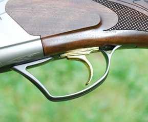 Although the styling is radical, the action of the test gun is quite conventional. It has replaceable studs near the knuckle upon which the barrels pivot. Coil springs power the hammers. The single trigger mechanism is of the usual inertia type. A barrel selector is placed on top of the conventional thumb operated top strap safety. Both safety and selector are well conceived. They were positive in action – indeed, far less fiddly than some. The shape of the adjustable trigger blade was reasonable too. The trigger pulls themselves were adequate if a little heavy.