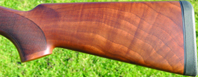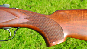 The full, quite short, pistol grip is quite tightly radiused and secured the hand well with a subtle palm swell – as mentioned previously. The grip moreover, was fairly even depth front to back (so the hand is not encouraged to slip forward in recoil). This is a feature I always like to see. The stock which is fitted with a recoil pad just under 1” in length is made from quite nicely figured, but lightly coloured, wood finished in matt oil with neat chequering in conventional panels (much to be preferred to strange squiggles and squirls). The schnabel forend - which has a self-adjusting mechanism to allow for wear at the knuckle - was less waisted than some with a reduced lip to the front. It looks a little chunky in profile, but feels comfortable.