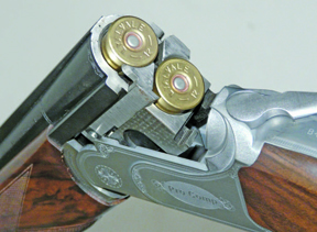 The looks of the basic mechanical steel boxlock action are specific to the gun’s purpose. The brushed satin finish is broken by the gun’s Pro Comp name being engraved against an oval background, the gun’s full nomenclature of Fausti Pro Competition in more formal script on the base. These designations are in turn complimented by simple border scrolls that replicate on the forend irons and trigger-guard. And it’s the trigger blade itself that is noteworthy, what appears to be exaggerated curvature actually very user friendly and allowing for a far more deft deployment and sensitivity. Enhancing the trigger’s striking looks is the fact that by depressing the small detent on the left, the blade can quickly be moved within five predetermined location that allow the shooter to reposition the blade and so instantly alter the overall length of pull by 5/8th of an inch.