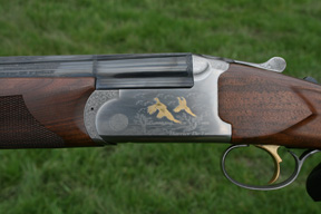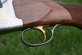 I like the top-lever, and the Browning style safety-combined-barrel-selector was especially good because of its practical size and positive function. The gun has an inertia operated single trigger mechanism and the trigger blade is quite large and gold-plated - more bling. Trigger pulls were adequate and everything functioned as it should. There is nothing much wrong with the action on the mechanical front. It is notable though, that this pattern of action works better, aesthetically speaking, on a 20 than a 12. The under lump necessitates a deeper profile - something one can get away with more easily in a 20 than a 12.