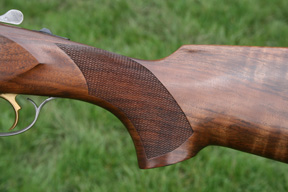 Let’s consider the rest of the Harrier spec. It has 30” multi-choked barrels and has quite a lot going for it in most departments. It is well finished, the stock was made from good wood and the shapes and standard dimensions are better than average. The chequering - probably cut by laser - was practical; well cut diamonds and not too small, providing good purchase. The grip was quite tightly radiused, but even in depth and therefore ergonomically efficient. The Schnabel forend was good of
