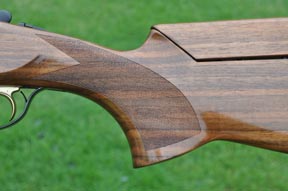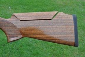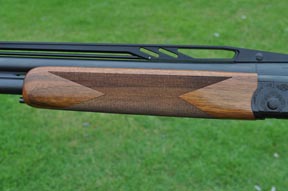 The stock is made from fairly straight grained walnut and has a large, fairly tightly radiused pistol grip (with a well conceived palm swell) and rounded forend which is not too bulbous. The length of pull is quite long – just under 15” with the trigger in the rear position. But, I have to say this suited me “Mr 5ft 11inch average build” perfectly. Drop – and the dimensions are approximated because of the adjustable rib – are 1 ¾” to the front, 2” to the rear (with comb down and rib in mid-way position) and 2 ½” to heel. Some cast off for a right-hander – a little more than the average – was also evident. I thought these measurement all very sensible. Chequering on butt and forend were good as well, and there is a thin black rubber recoil pad.