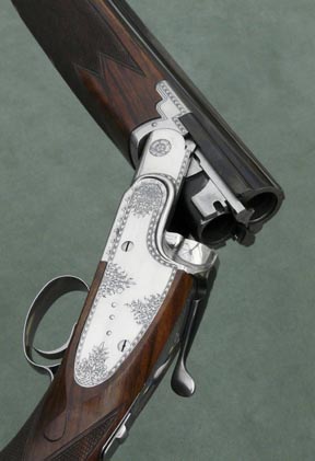 Even in basic form the Hesketh is a genuinely attractive 12 bore as are the standard hardwood frame and panama canvas or luxury leather and calfskin travelling cases, along with the rosewood cleaning kit and tools. The long external surfaces of the four pin Boss influenced sidelock are picked out with small clusters of scroll work with an attractive pattern of corn ears that pick out the borders and forend irons, rosettes picking out the hinges. And for those who want to personalise their Hesketh, all engraving designs and art work, like the gun, are carried out and applied in – house, the process undertaken by James’ daughter Chloe. This means that no matter how unusual or intricate the end result will be exactly as you require.