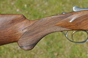 The stock on the test SX3 was made from a good piece of nicely figured walnut. The semi-pistol grip is my favourite on an over and under game gun. This grip feels especially comfortable and, unlike a full pistol, is not difficult to hold up in the ready position, muzzles high, as one awaits one’s birds. I also liked the stock design and dimensions (although, you may order whatever you want). Length was 14 3/4”. Drop at comb was 1 3/8” and just a whisker under 2 1/8” at heel. This suited me very well and might be considered a standard shelf dimension for the gun. A fairly thin black rubber pad is fitted and it has a leather backing to avoid mounting glitches
