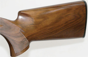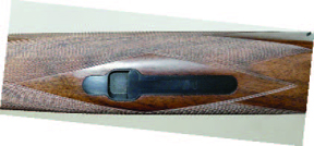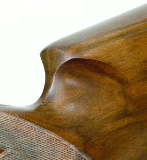 Most of all it’s the broad comb that stands out. I personally found it very comfortable finished not in the usual tapered, round point but in what’s best described as a chamfered square section. Forming a feature of the stock in its own right, like the ornamentation you’ll either appreciate the comb nose style or won’t. The profile has allowed the scalloping between the grip and the stock head to be deeper profiled than usual so keeping the shooter’s hand in a more vertical position, whilst the palm swell’s profile have been designed to help the hand replicate the exact same hold, while the stock still promote ease and fluidity of movement.