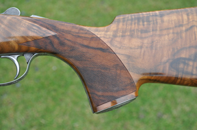 The stock, though beautifully finished, lets the gun down a bit in my opinion. I didn’t like the grip especially as mentioned, and the form of the grip and comb is BIG. Both could be slimmed to good effect. I don’t advocate excessively small grips (nor thin combs) but this grip is just too much. The primary stock dimensions are sensible - 14 7/8” for length with a thin wooden butt plate. Drop is 1 3/8” and just over 2” respectively at the front and rear of the comb – not much to argue with there. The finish to the wood is exceptional, as noted, and the chequering is fine and extremely well executed. The forend is truly splendid – one of the best that I have ever held – it would be hard to improve on its design.
