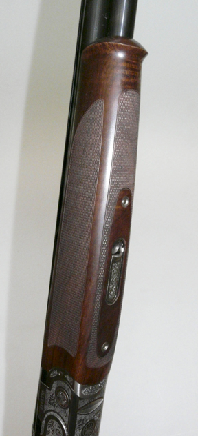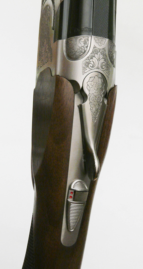 These in turn mate up to the extensions that project from either side of the 3” chambers of the monobloc 28” barrels whilst the two pegs that extend from the face of the action locate to both sides of the top chamber so ensuring a tight, reliable and secure lock up when the gun is closed. Since this Silver Pigeon 1 is a field gun, as might be expected the side ribs are solid although the vented top-rib exhibits a degree of cross-over, the 8-10mm taper and large white bead as suited to clays as it is to pheasants. Further back more ornamentation is to be found on the fences whilst a short throw top-lever that has been designed and positioned to offer excellent leverage with Beretta’s familiar over-sized manual safety catch just behind that incorporates the usual sliding barrel order selector.