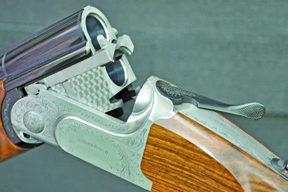 The locking system of the Perseus, like most Rizzini type over and unders, involves a full width bolt coming out of the bottom of the action face and engaging bites beneath the bottom chamber mouth. It is a well proven (inspired by Browning, of course, and seen in many other guns). The only potential disadvantage – greater in a 12 than a 20 - is that placing the bolt and bites beneath the bottom chamber mouth makes the action a little deeper than in those designs where there is a split hinge pin and no need to have the barrel lumps/lugs beneath the barrel.