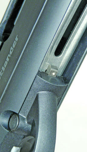 Staying with the combustion end of the Outlander a black button just below the ejection bolt releases the bolt whilst a short extension to the rear of the chrome shell lifter acts as the bolt lock actuator, pushing it rearwards dropping the lifter in the process. A larger polymer trigger guard with the easy to locate and activate oversized cross-bolt safety is situated to the front of the guard and falls instantly to the shooter’s trigger finger prior to hooking onto the chrome, non-adjustable blade whilst Beretta have now incorporated various A400 aspects into the general mechanism of the Outlander.