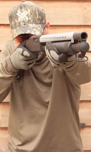 The AGM is really a replica of the Mossberg 590 ‘Special Purpose’ shotgun that’s available from Mossberg & Sons in the real world, and with the metal heat shield over the top of the barrel it looks great. It looks like the real thing, has a 15 round magazine, shoots straight as a die, and it costs less than most site fees for the day!