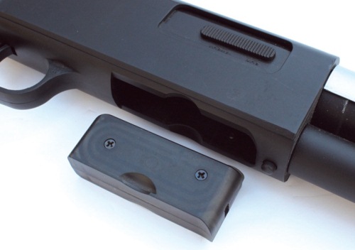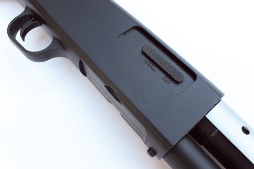 A spring action shotgun is easy and cheap to add to your collection too; the AGM that I’m talking about here can be had for around the 25 quid mark, so it’s not going to break the bank! You may think that a simple pump action is not going to hold much sway against a full auto AEG, but I’d say think again. The AGM kicks out a respectable but site-friendly 300fps+ on a .20g BB, and given that it has an effective integrated slide hop-up and a reinforced metal barrel it is actually pretty insanely accurate out to a good distance, even with the (extremely) rudimentary sights it has as standard. The pump action is good and solid, each BB loaded with a pleasant ‘clack, clack’. The safety catch on the top of the shotgun is purely decorative, but there is a functioning one that is secreted to the rear left of the trigger guard.