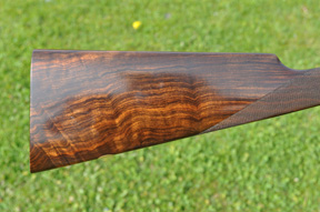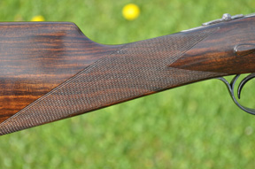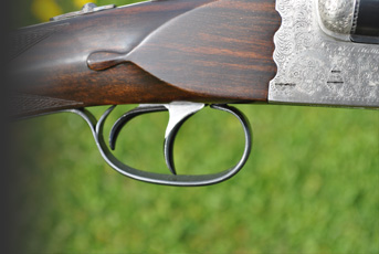 First impressions are certainly positive. The styling is good, I liked the silver polished and scalloped action (colour case hardening is a no cost option). The straight-hand, English-gripped stock is classically styled and ergonomically efficient. The scalloping gives a quality look – if you look in the catalogues of English makers like Thomas Bland, you will see the deluxe guns often had scalloped actions and more engraving coverage. The scroll in this case is especially attractive and well executed without being over the top. I also liked to see the articulated front trigger – another quality touch.