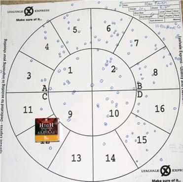 In the Fausti, I shot a load of 28 gram of No. 7.5 shot in a 70mm case and fibre wad. It shot a total of 193 pellets within 30 inches, with 48 inner strikes and 145 outer strikes for a good dense pattern.