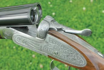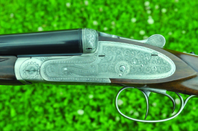 The action, which is made from a forging, is of classic design. It is, in essence, a Holland & Holland sidelock with disc set strikers added. V springs power the hammers, and there are intercepting safety sears in the locks. These depart slightly from the Holland pattern in that the intercepting safety sear, itself, is powered not by the usual small and delicate leaf spring, but by a small coil spring in a tube acting on a small piston/rod pushing against the sear arm. Ejector work is of reliable Southgate pattern operating on the over-centre principle.