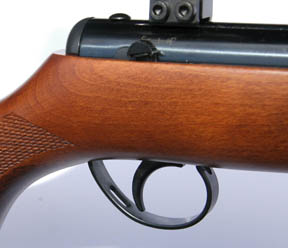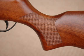 This latest model shows notable improvements with regards to cosmetics, and first impressions inevitably focus on the subtly revised woodwork. Gone is the trademark parallel sided fore-end, so synonymous with BSA classics of old such as the Meteor, Mercury and Airsporter. Gently tapering forward from the trigger area, the fore-end has now been fractionally increased in length, fully covering the articulated cocking linkage. The grip is nicely proportioned to offer a comfortable hold in the aim. Stylish panels of chequering adorn both the grip and fore-end. The test rifle displayed some really nice grain from the beech stock, showing through the matt lacquer finish. Couple that with the traditionally blued metal work, and the Supersport can’t fail to be anything other than a smart little rifle. One final nod to its lineage comes with the name picked out in gold lettering across the cylinder, in time-honoured BSA tradition.