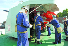 I was allowed to stand behind B Gun on the condition I stayed out of the way and wore ear defenders. The gun crews were made up of men and women from the group called the ‘Wavy Navy’ which also had a display on the quayside. At midday on the Saturday three rounds were to be fired from each of the ship’s three guns and shell cases had to be prepared. The crews were kitted out in overalls, steel helmets and anti-flash hoods as they would have been when firing the guns in action. The flash hoods were to protect them in case there was any unburned powder which would flash back when the breech was opened to reload. In reality the shells would have been fixed which is to say the projectile head was fitted to the shell case and was a bulky thing to lift.
