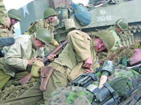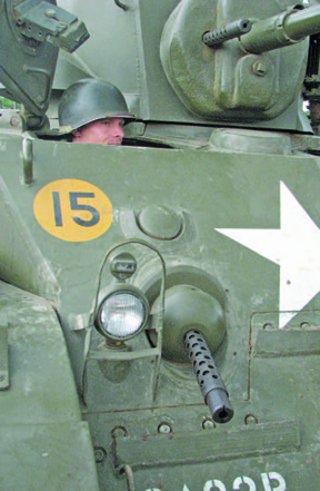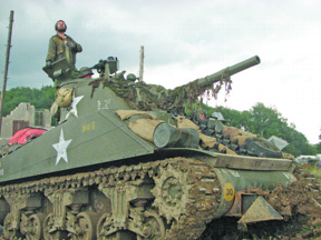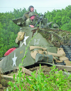Looking up from my shell hole I saw an M5 Stuart Light Tank drive between two of Danny’s buildings. From the roofs and upstairs windows German troops were firing but the tank rolled on followed by an M4 Sherman. In the turret was ‘Oddball’ looking like a scene from the movie ‘Kelly’s Heroes’ and all very surreal. These vehicles passed within metres of my position and even with wide angle setting on my lens the tanks were so close they completely filled the viewing aperture. Some re-enactors were taking photographs but I noticed one or two had mounted cameras on their helmets to capture the all drama. This is something troops do operationally in Afghanistan and leaves both hands free. I am not one to say ‘I told you so’, but I did predict this feature a few years ago in this column.