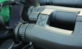 The eye cups can be adjusted to suit glasses and non-glasses wearers with five, click-stop positions. The build is rubber armour over a magnesium alloy body. On the rear R/H bridge are two buttons – on the left the MEASUREMENT/laser actuator (dome headed) and next to it the SECONDARY/selector (dished head) for choosing the various functions and ballistic programmes. Their distinctive individual profiles meaning you can with just a touch tell which one you are on.