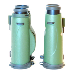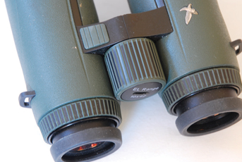 Control-wise there’s a discrete firing button on top of the rear left bridge with a mode (programme selector) button on the lower inside hinge point. A CR2 Lithium battery is housed in the central focusing drum. This is the major mechanical change as the new EL binos use that control to set-up individual eye focus. The Range instead shows focusing wheels on each tube.