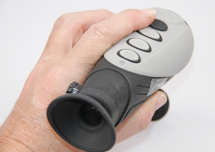 The sensor has a resolution of 640 x 480 pixels for a highquality image and combined with the AMOLED frost-free screen you now have a highly detailed image. It is a black and white screen with a black or white hot-detection option too. At the rear are the twin eyepieces that give a true binocular vision and a more relaxed viewing of the target.