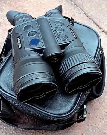 Consequently, the new Merger sports a pair of round barrels positioned on either side of a cylindrical central bridge, looking to the casual observer like a pair of high-end roof-prism binoculars. Close examination, however, reveals that all is not as it seems. To begin with, the lenses in each barrel are different sizes, because the left barrel contains the 50mm germanium-glass lens for the associated 640x480, 17 μm thermal sensor. The right one is occupied by the laser rangefinder, with its smaller optical lens and neatlyinset laser emitter. External symmetry is maintained, however, as both barrels have identical diameters, matching rubberised semi-rigid lens covers, plus polymer panels for increased grip and coldweather comfort.