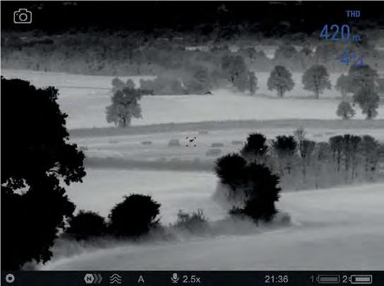 Control functions will be largely familiar to existing Pulsar users. POWER shows a fast start-up time of just 5 seconds and incorporates a batterysaving standby mode that deactivates the display. CAMERA lets you choose between recording stills or video, and includes a useful ‘pause video’ function that lets you capture just the bits you want when observing your quarry, without creating multiple files. Recording quality is up, too, with files saved at 1024x768 and in .mp4/. jpg formats (vs. the Accolade’s 640x480 and .avi video). RANGING, meanwhile, reaches out to 1,000m, and includes a ‘scan’ function for pinging moving targets and those in difficult terrain. A choice of reticles is available in the menu, too.