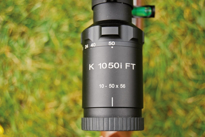 The finish is a quality matt black with all detailing neatly etched and finished in white. I was told that there is a silver finished model and I believe these will also be available in the UK by the time you read this. There’s a dioptre adjuster ring on the ocular lens, but for me the reticle was bright and clear, so I left it alone! The magnification ring runs from 10 – 50x; Kahles state these are actual figures, so 50x = 50x! Operation is silky smooth and requires little effort; other manufacturers please take note! The innovative part of the 1050FT is the saddle. On the left, where the parallax adjustment usually is, is the rheostat, turrets are in the usual places but surrounding the elevation unit is the parallax adjuster.