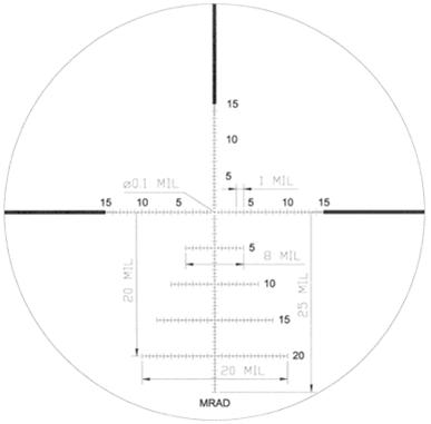 The reticle is a MIL/MIL design, for use in conjunction with the turrets. It is in the first focal plane (FFP) meaning that the reticle values remain the same throughout the magnification range. It features a well thought out 0.1-Mil floating illuminated dot in the centre, controlled by an 11-position rheostat on the side of the scope. The reticle has evenly-spaced marks on the horizontal and vertical axis, with every five mils being marked.