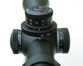 To stop any confusion after the first full turn a red indicator button pops up out of the turret to indicate you are now reading the top elevation figures. The adjustment is fine and precise with audible and tactile clicks! You get 10-clicks per numerical division with 13 for one full turn that’s 2.5m at 100m max or 25 Mil, in fact a max of 260 clicks in total. Windage has the same value with a total adjustment of 1.1m at 100m (11 Mil)